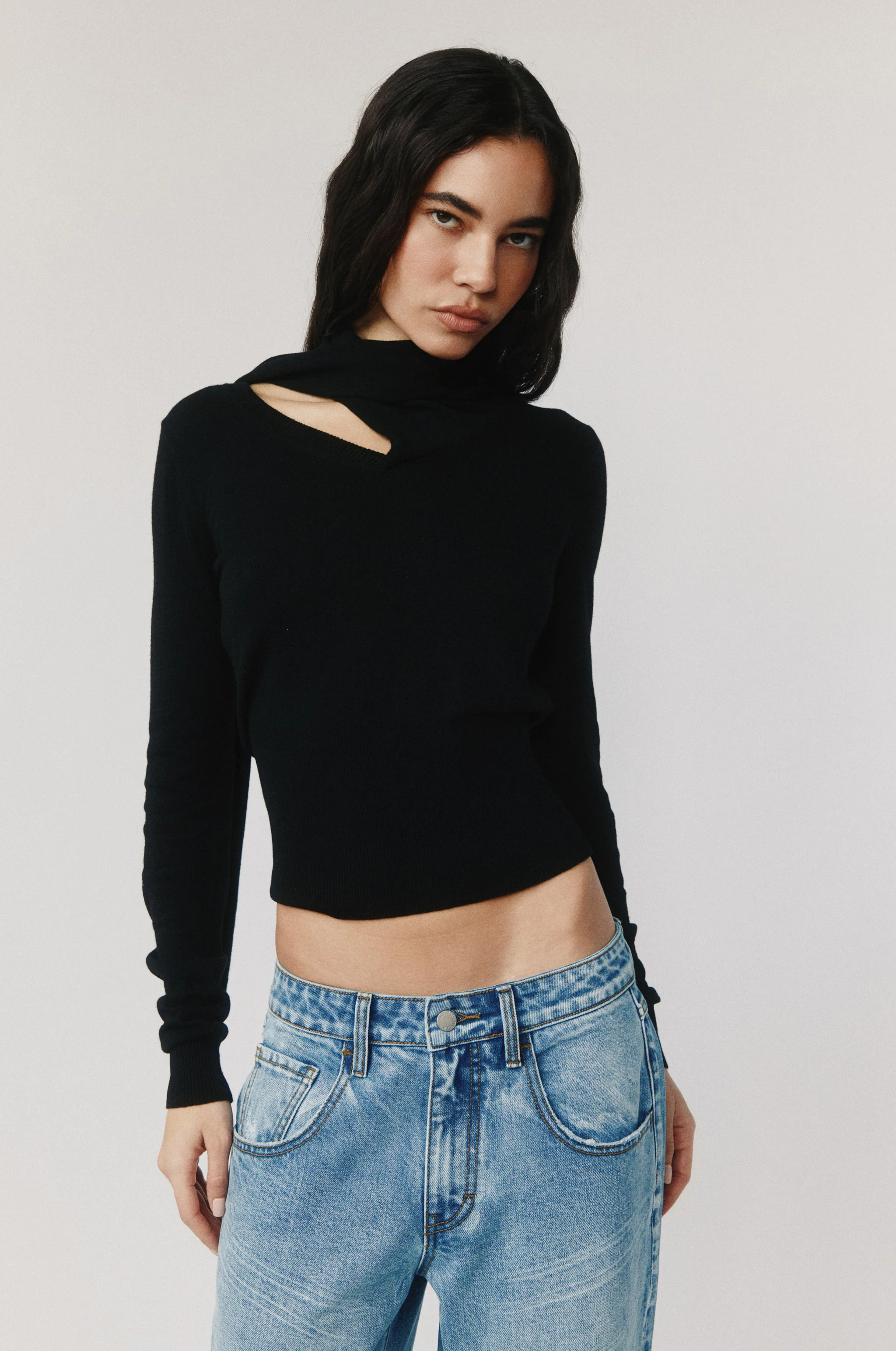 The Phoebe Top is a long sleeve knitted top with a V neckline and neck scarf design. Finished with ribbed cuffs and waistband.