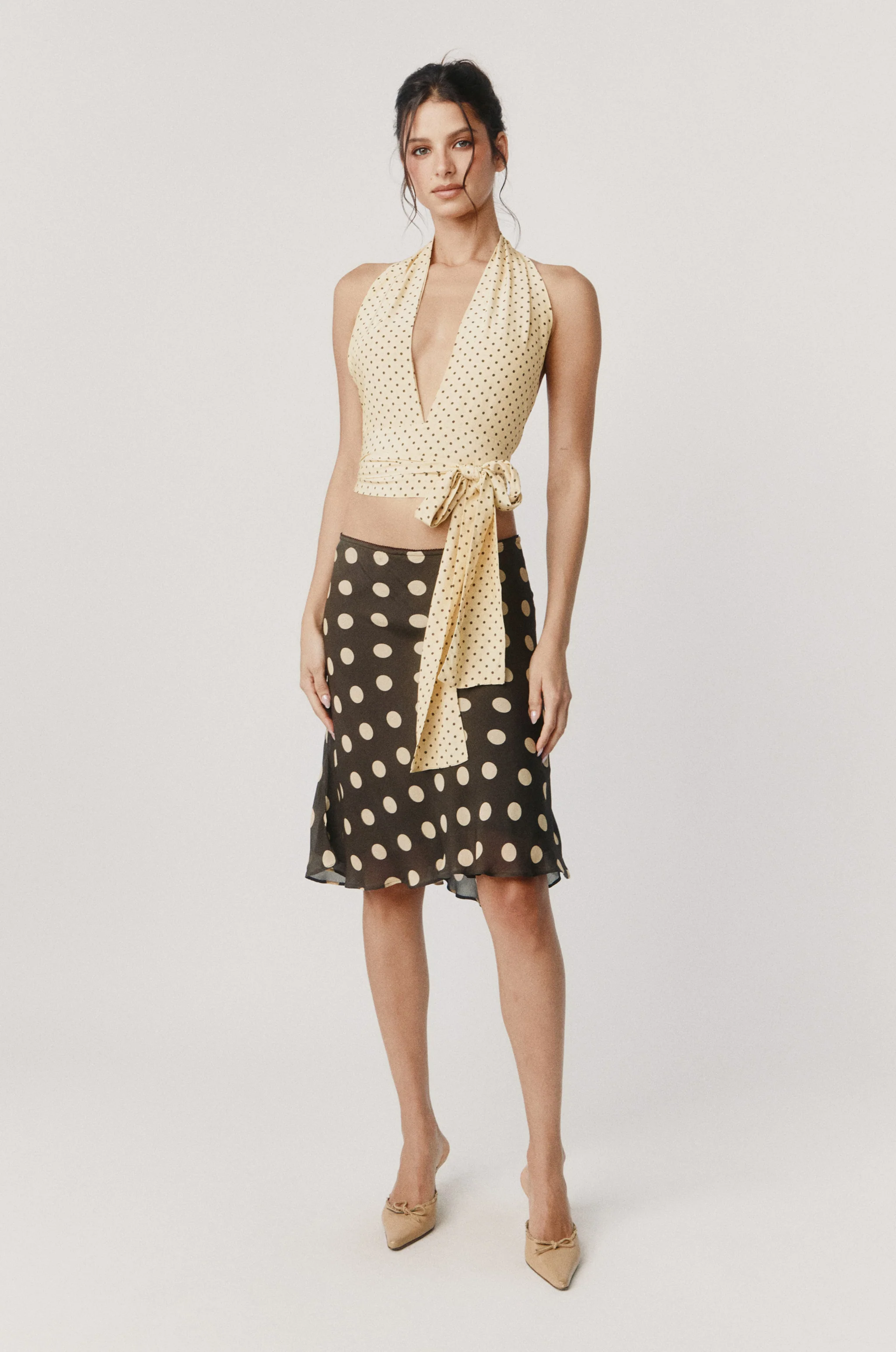 The Rendezvous Top is a halter-style, wrap top featuring a V-neckline with adjustable ties at the neck and back.